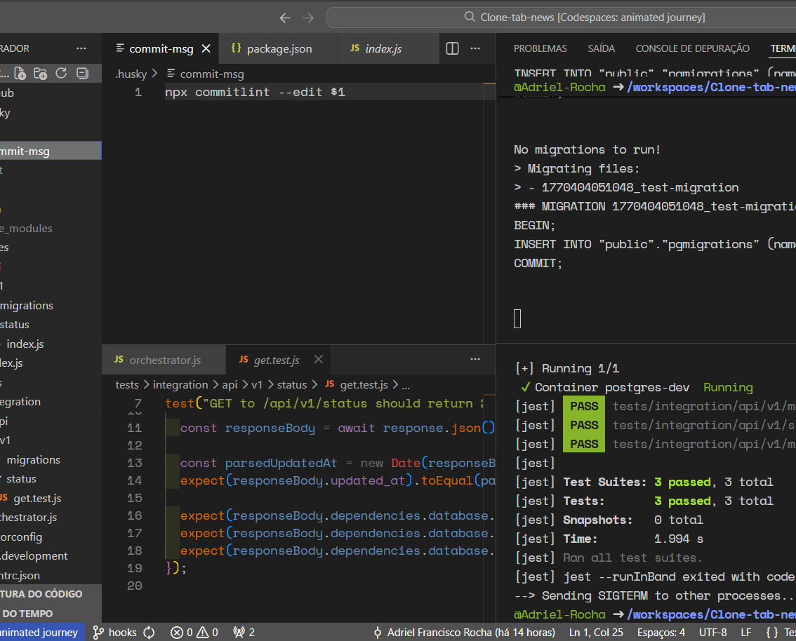 Projeto fullstack relizado a partir das aulas do curso.dev com sistema de migrações, endpoints para CRUD, endpoint de status que retorna informações detalhadas sobre a saúde da aplicação e conexões com o banco de dados PostgreSQL, testes automatizados, Linter de código e de commits, além de continuous integration.